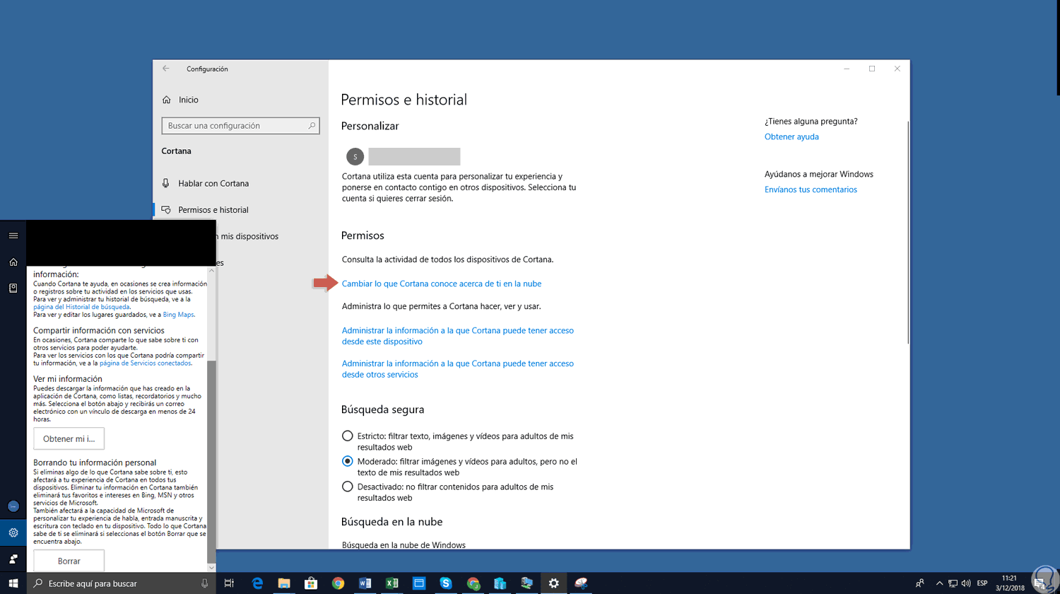 Allí vamos a la categoría “Cortana” y veremos diversas opciones de configuración, recordemos que, con el objetivo de generar resultados personalizados, Cortana supervisa toda la actividad diaria en Windows 10 y así analiza la información personal de cada usuario donde se ven involucrados aspectos como contactos, correos electrónicos, consultas de búsqueda, ubicación, historial de Internet y más. Para detener este análisis de Cortana, en la ventana desplegada vamos a la sección “Permisos e historial” donde veremos lo siguiente: