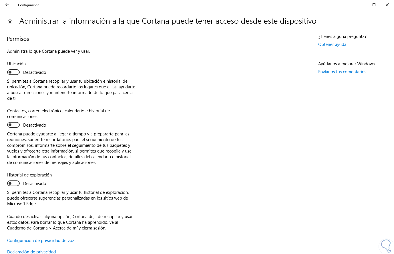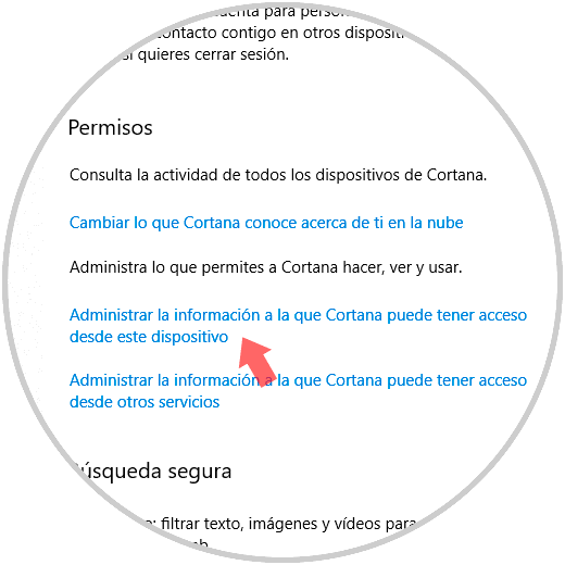Allí damos clic en la línea “Administrar la información a la que Cortana puede tener acceso desde este dispositivo” y en la ventana desplegada activamos o no los interruptores de cada opción según sea requerido: