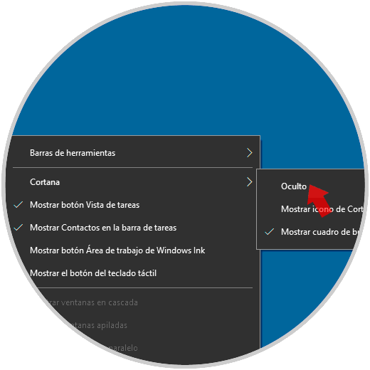 Luego de este proceso podemos dar clic derecho en la barra de tareas de Windows 10 y en la línea “Cortana” seleccionar “Oculto”:
