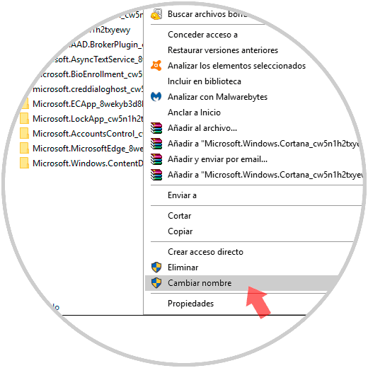 Esto nos redireccionara a la ruta “C:\Windows\SystemApps” y allí debemos dar clic derecho sobre él y seleccionamos la opción “Cambiar nombre”: