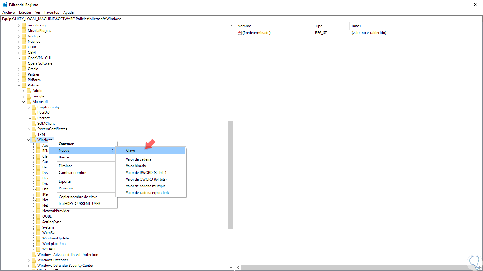 Allí damos clic derecho sobre la clave “Windows” y seleccionamos la opción “Nuevo / Clave”:
