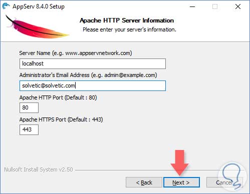 Ahora, en este paso tenemos que introducir localhost como nombre del servidor, también nos pide el correo electrónico del administrador (por ejemplo: webmaster@gmail.com). Configuramos el puerto para HTTP y para HTTPS. A continuación, pulsar Next >.