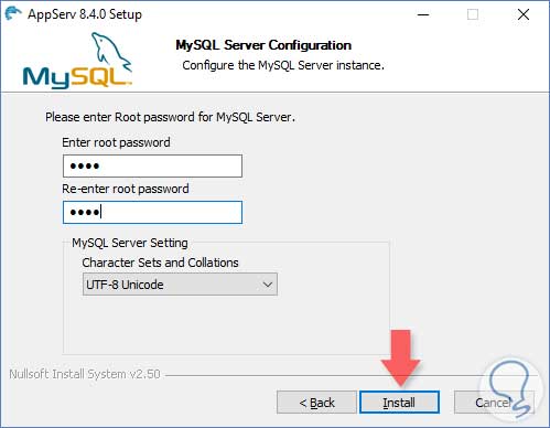 En este paso vamos a configurar MySQL. Introducir la contraseña de acceso al servidor MySQL por parte de root (mínimo 8 caracteres). Mantener "UTF8 Unicode" como el juego de caracteres predeterminado por defecto. Y pulsamos en Install.