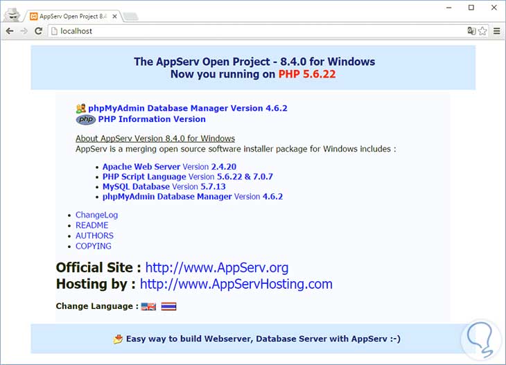 Por último comprobaremos que la instalación se ha realizado correctamente. Para ello abrimos el navegador e introducimos localhost como dirección. Si todo está bien, deberá mostrarse la página inicial de AppServ Open Project. Ya puedes empezar a realizar lo que necesites con tu servidor web montado de forma rápida.