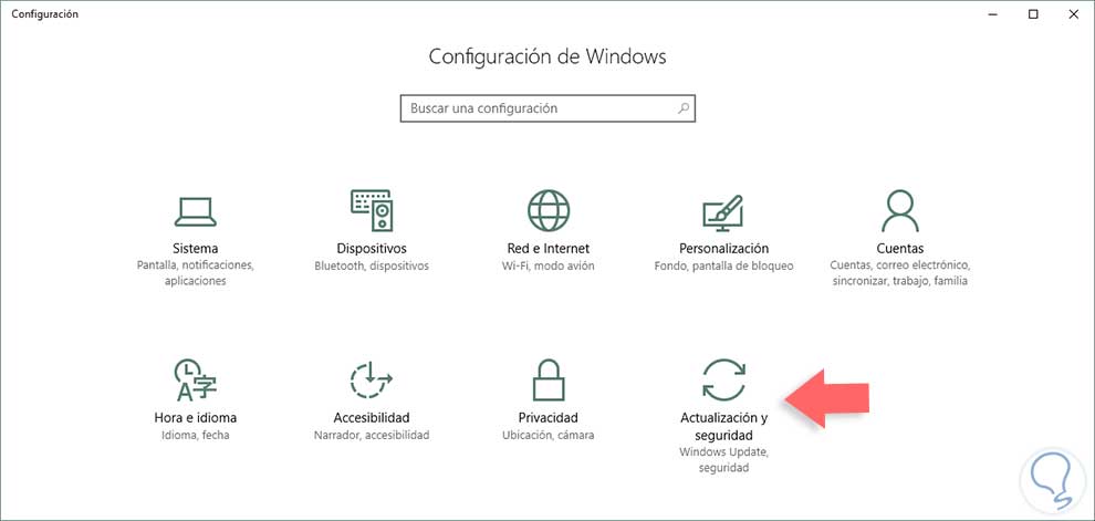 Accedemos desde el menú Inicio a la opción Configuración, allí seleccionamos la opción Actualización y seguridad: