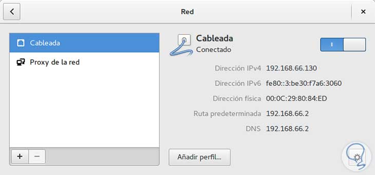 Nada complicado, como podéis ver. Además podéis obtener está información de manera gráfica, puedes ir a "Ajustes de sistema" o "Configuración" y entrar en Red, verás algo parecido a la siguiente imagen: