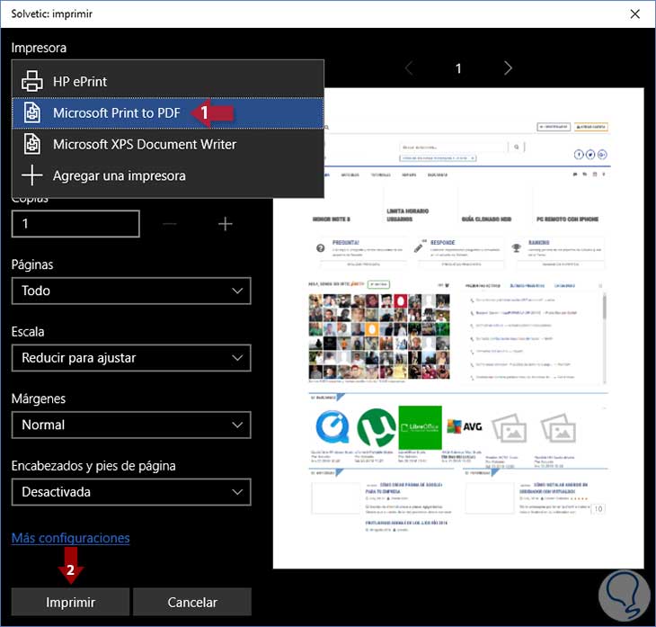 Salen unas ciertas opciones y una visualización de lo que se va a Imprimir, o guardar. Nos interesa la opción Impresora, que es lo que tenemos que modificar, así que pinchamos en el desplegable, y veremos unas cuantas opciones, elegimos Microsoft Print to PDF.