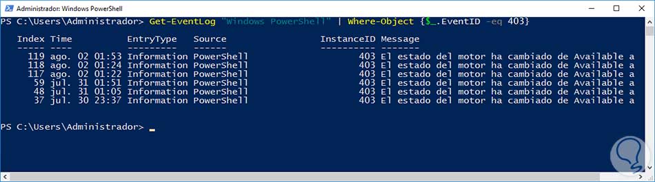 Get-EventLog "Windows PowerShell" | Where-Object {$_.EventID -eq ID_EVENTO}
