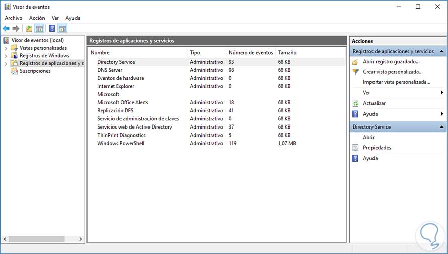 Dentro de este campo podemos encontrar todos los eventos relacionados con los servicios del dominio y las aplicaciones del mismo como Internet Explorer, Windows PowerShell DNS, etc.