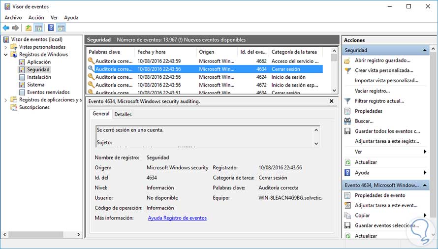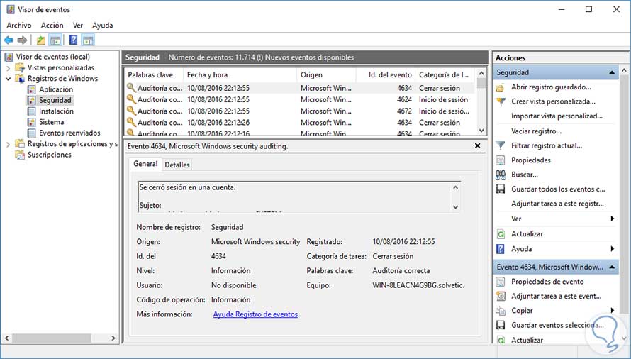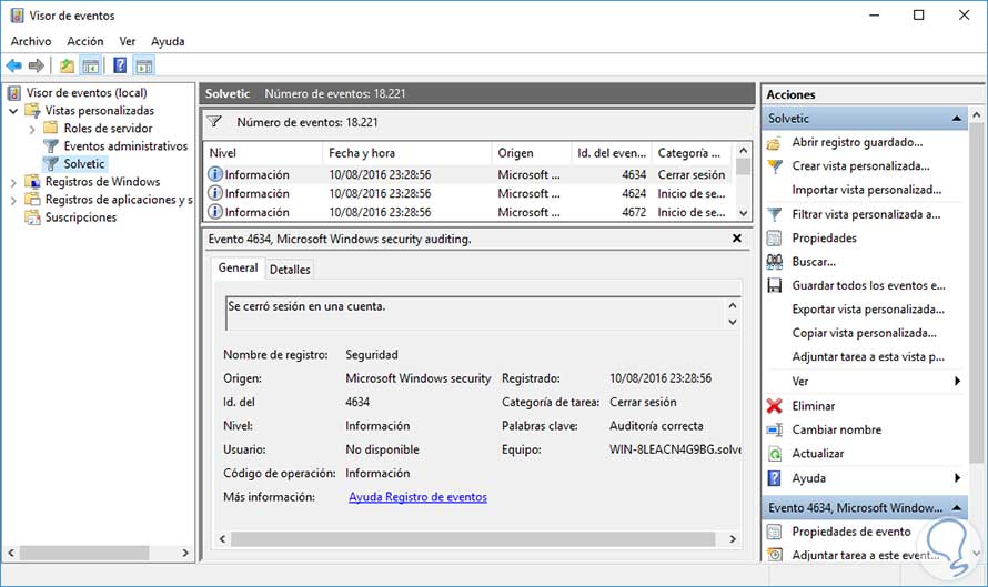 Las demás opciones que tenemos dentro del visor de eventos son: