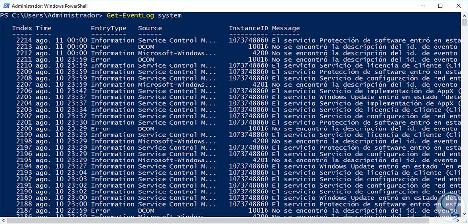 Get-EventLog Nombre_GrupoPara este caso vamos a ver los eventos que están dentro del grupo System, por ello ingresaremos lo siguiente: