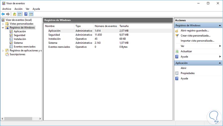 Es quizás la opción más usada por todos nosotros ya que dentro de esta opción tenemos eventos asociados a temas como: Seguridad, Aplicación, Sistema, Instalación, etc.