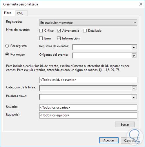 Es posible que en algún momento deseemos crear nuestras propias vistas de algún evento. Para ello vamos a seleccionar la opción Crear vista personalizada y veremos que se abre otra ventana. Allí ingresaremos los parámetros con los cuales deseamos crear la vista, podemos especificar IDs de eventos, nivel de eventos, etc. En este caso seleccionamos los niveles Advertencia e Información.