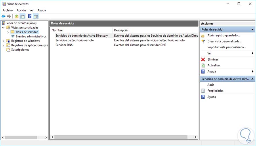 Mediante esta opción podremos crear vistas de acuerdo a nuestras necesidades y así mismo contamos con la opción de ver los eventos que ocurren con los roles del servidor tal como el DNS, el escritorio remoto, etc.