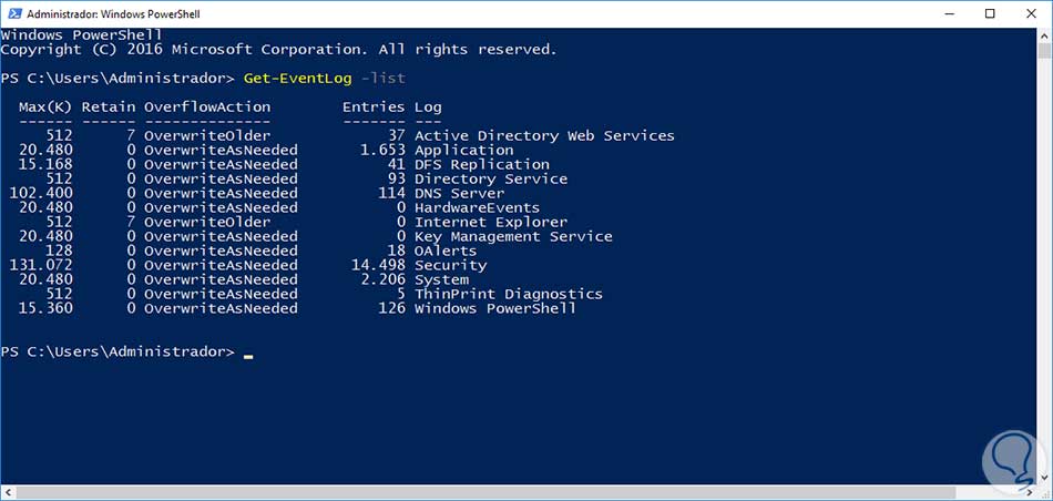 Get-EventLog -listY podremos ver de manera detallada el listado de eventos indicando tamaño, nivel de evento, cantidad de eventos, etc.