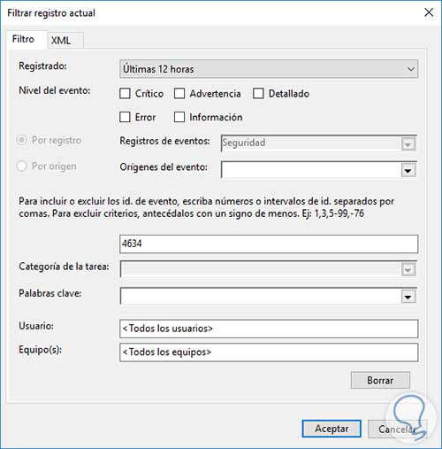 Para crear un filtro de archivos seleccionamos la opción Filtrar registro actual y veremos una nueva ventana, aquí podemos definir las condiciones que deseamos para el filtrado de nuestros eventos. Para este caso buscaremos todos los eventos con el ID 4634 en las últimas 12 horas.
