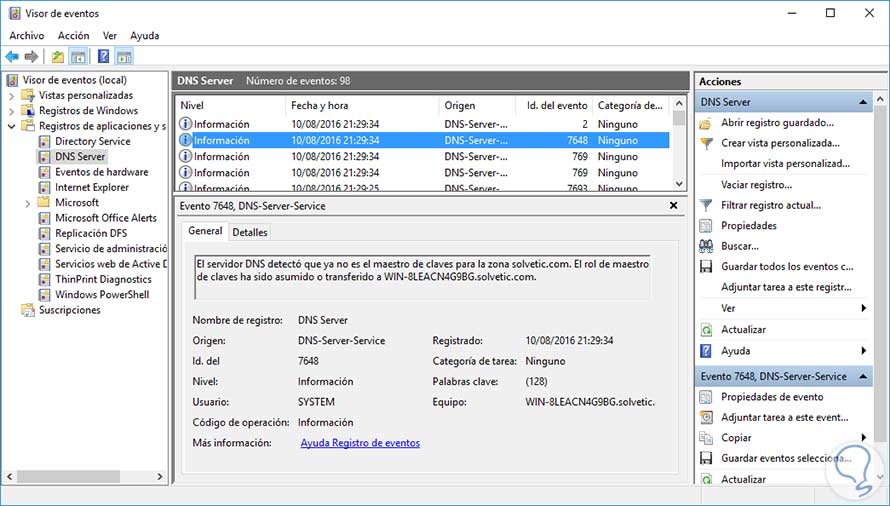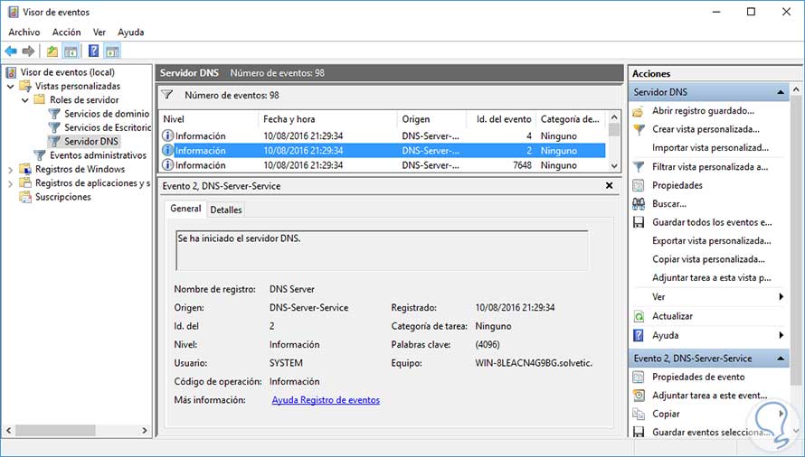 Para este ejemplo vamos a ver los eventos dentro del grupo DNS Server por lo cual ingresaremos lo siguiente:
