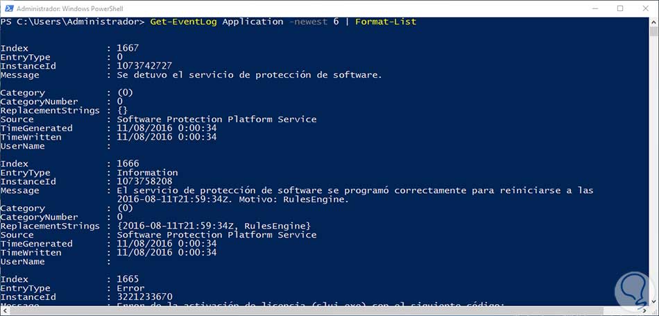 Get-EventLog Nombre_Grupo -newest Cantidad_de_eventos | Format-ListPodemos obtener información detallada de los últimos eventos de un grupo en especial. Vamos a ver la información de los últimos 6 eventos del grupo Application.