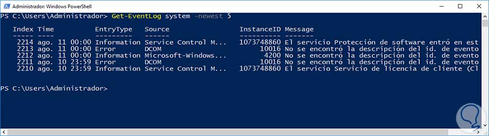 Get-EventLog Nombre_grupo -newest Cantidad_de_eventosPara este caso veremos los últimos 5 eventos que han acontecido en el grupo System, ingresamos lo siguiente: