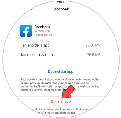 Seleccionamos la aplicación la cual queremos eliminar. Como podemos ver WhatsApp y Facebook suelen ser de las aplicaciones que más espacio ocupan en nuestro teléfono. Una vez seleccionada la aplicación que queremos quitar para liberar espacio, hacemos clic en “Eliminar App”.