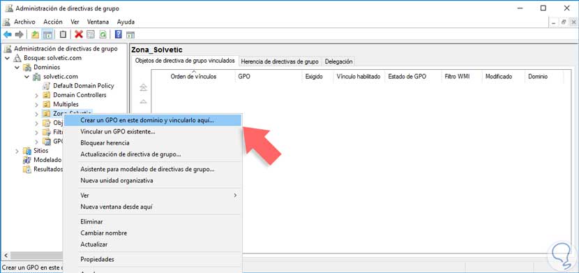 Hemos creado una unidad organizativa llamada Zona Solvetic. Como primer paso abriremos el administrador de directivas de grupo usando la ruta:
