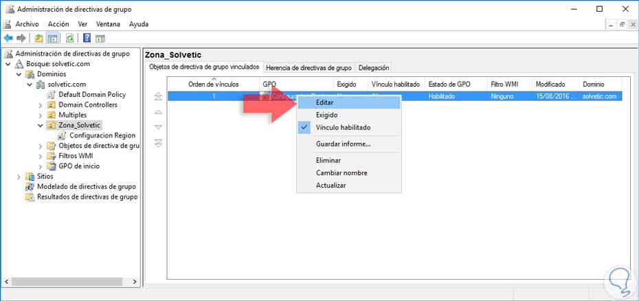 Pulsamos Aceptar y podremos ver que se ha creado la política en la unidad organizativa seleccionada. Seleccionamos la política, damos clic derecho y seleccionamos Editar.