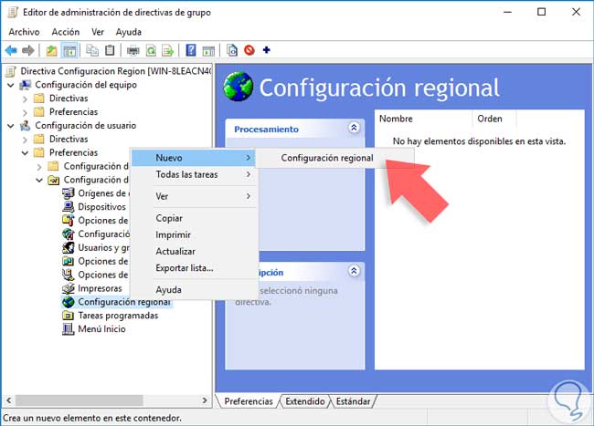 En esta opción daremos clic derecho sobre “Configuración regional” y seleccionamos Nuevo > Configuración regional.