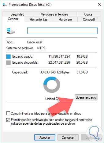 Allí pulsaremos la opción Liberar espacio, podemos ver que inicia el proceso de análisis de Windows.