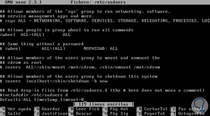 sudo nano /etc/sudoersSe abre un fichero con texto, vamos a ir al final de este archivo usando las flechas de desplazamiento y debemos ingresar lo siguiente: