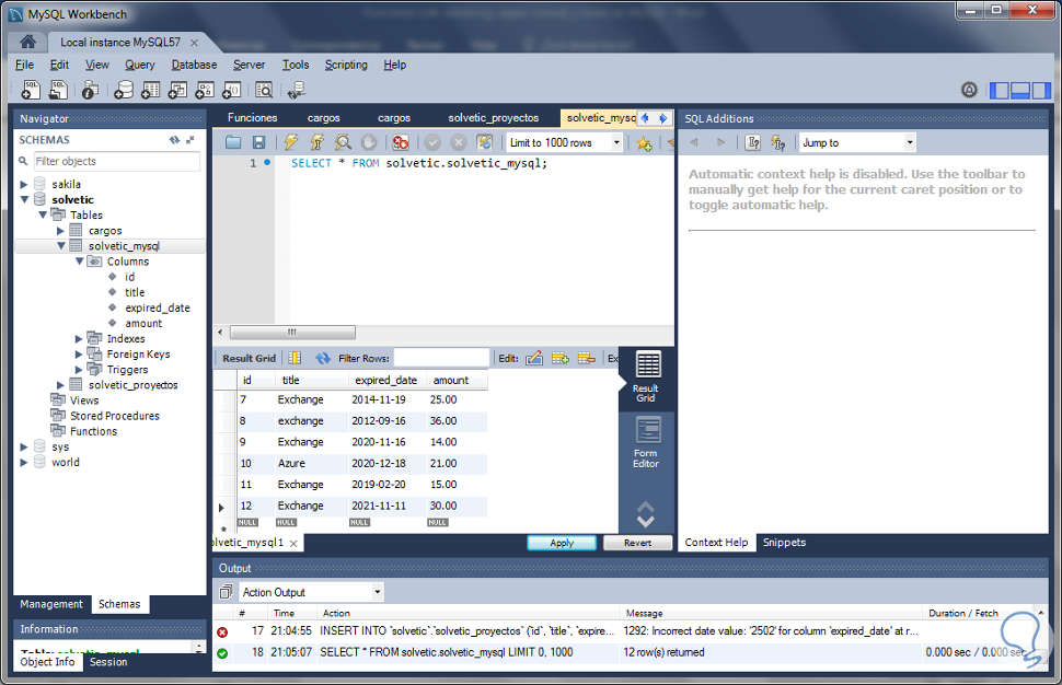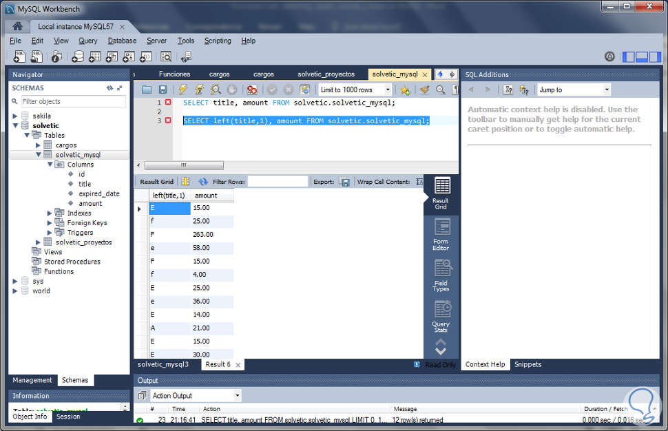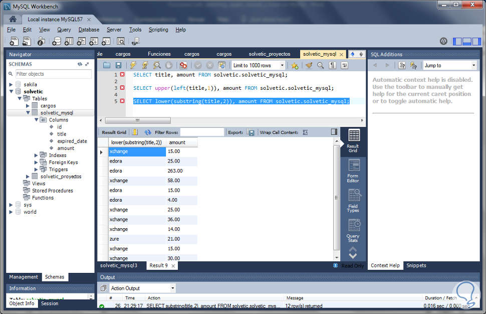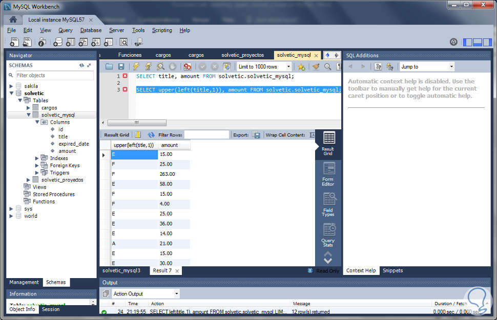 SELECT concat(upper(left(title,1)),lower(substring(title,2))), amount FROM solvetic.solvetic_mysql;El resultado final del uso de esta función es el siguiente: