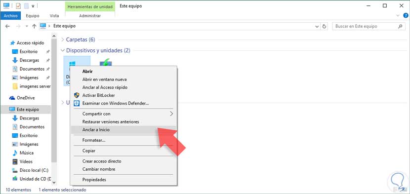 El primer paso que vamos a realizar después es dar clic derecho sobre la unidad que deseamos anclar a la barra de tareas, en este caso la unidad C, y seleccionar la opción Anclar a Inicio.