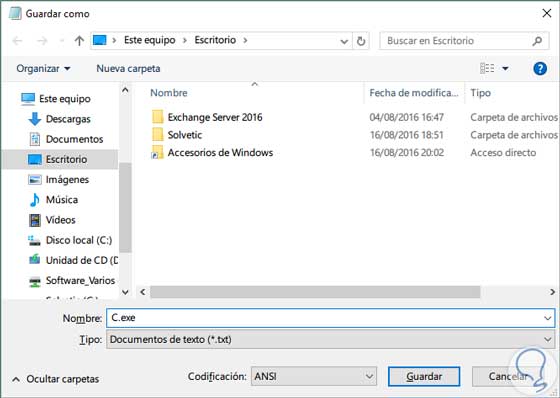 Abrimos el bloc de notas y lo guardamos con la siguiente sintaxis. No es necesario ingresar información en el archivo, en este caso la guardaremos con el nombre C.exe