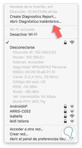 - Pulsando la tecla Opción y seleccionando el icono de red WiFi ubicado en la parte superior y seleccionando la opción “Abrir Diagnóstico Inalámbrico”