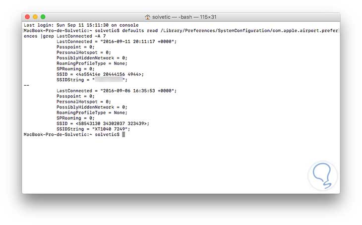 defaults read /Library/Preferences/SystemConfiguration/com.apple.airport.preferences |grep LastConnected -A 7Para equipos con Mavericks o sistemas inferiores debemos usar el siguiente comando: