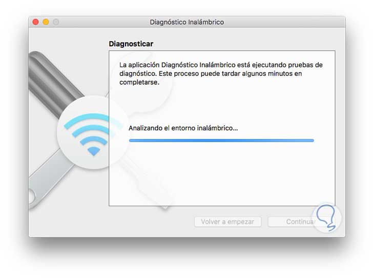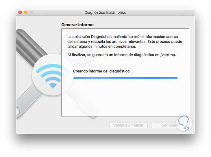 Pulsamos de nuevo Continuar y veremos que la herramienta de Diagnóstico Inalámbrico inicia el proceso de creación del informe respectivo.