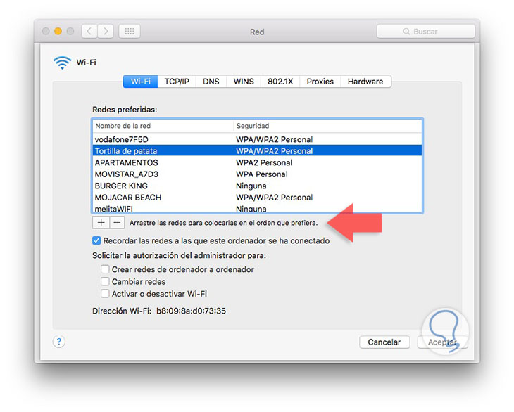 Tenemos una primera opción en la que vamos a dirigirnos a la preferencias de red inalámbricas del WiFi. Una vez aquí tenemos que seleccionar la pestaña de avanzado y en la parte superior en la sección WiFi, podremos ver el historial de todas nuestras conexiones. Tenemos la posibilidad de ordenarlas en función de nuestras prioridades, o de eliminar alguna de ellas en el caso de que no queramos mantenerla. Para ello la seleccionamos y pulsamos el botón de "-" situado en la parte inferior.