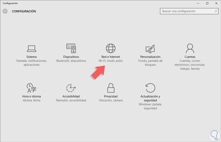 Una vez allí seleccionamos la opción "Redes e Internet" y veremos la siguiente ventana.