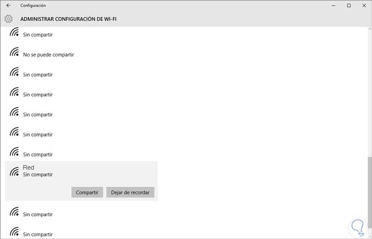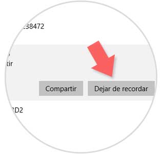 En esta ventana basta con seleccionar la red deseada y podemos ver que se despliegan dos opciones: Compartir y Dejar de recordar. Pulsaremos en la opción "Dejar de recordar" para eliminar el perfil y los detalles de la conexión a esa red en particular.