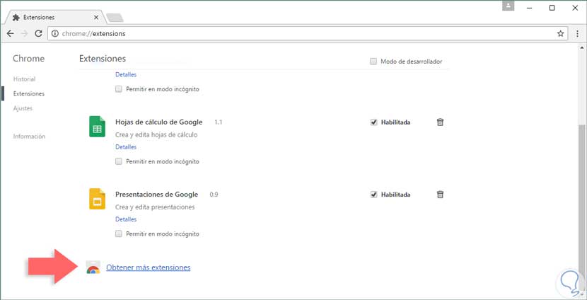 Se abre la siguiente ventana donde debemos desplazarnos hasta la parte inferior y seleccionamos la opción Obtener más extensiones.