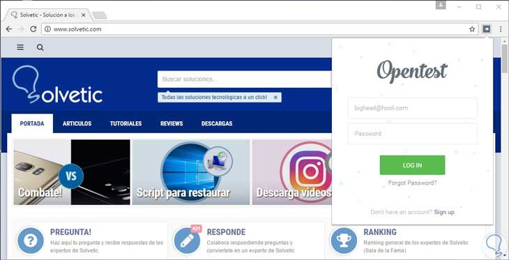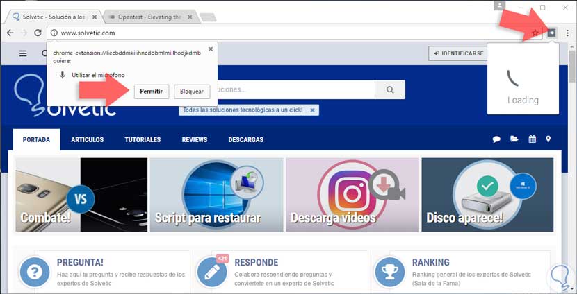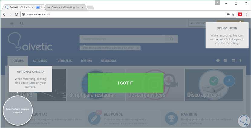 Para usar la extensión Openvid vamos a abrir la página web que deseamos grabar, en este caso solvetic.com, y pulsaremos el icono respectivo a la extensión Openvid. Veremos que se abre la siguiente ventana.