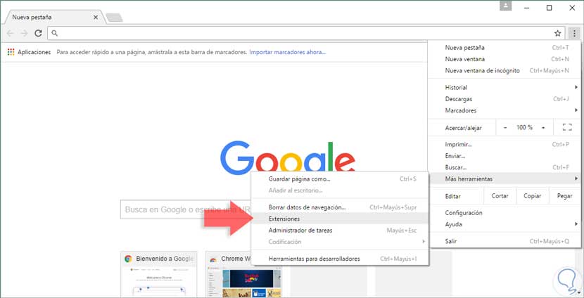 Abrimos Google Chrome, nos dirigimos al icono de personalización y configuración de Chrome y seleccionamos la opción Más herramientas > Extensiones.