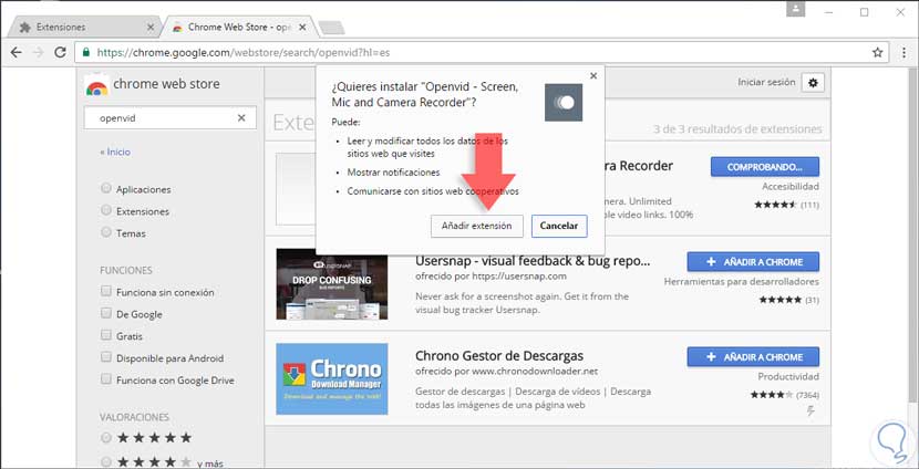 Seleccionamos la primera opción y pulsamos el botón Añadir a Chrome. Pulsamos Añadir extensión para que la extensión Openvid sea incluida en Google Chrome.