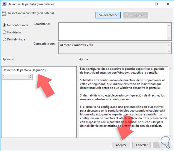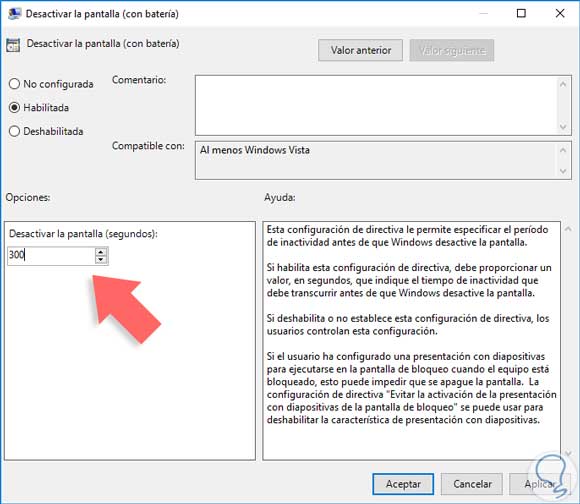 Para habilitar la política debemos activar la casilla Habilitada y en el campo Desactivar la pantalla (segundos) ingresar el tiempo en segundos que debe estar la pantalla sin actividad para que pase a suspensión, por ejemplo, si deseamos que la pantalla sea suspendida después de 10 minutos debemos ingresar el valor 600 en dicho campo.