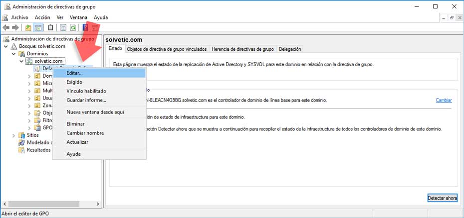 Para editar una política de grupo para este tema debemos abrir el administrador de directivas de grupo como se menciona en la parte superior de este análisis.Una vez abramos el editor de directivas de grupo vamos dar clic derecho en Default Domain Policy y seleccionaremos Editar.