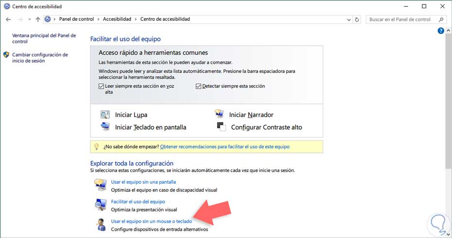 Pulsamos sobre Accesibilidad, luego en Centro de accesibilidad y veremos la siguiente ventana.