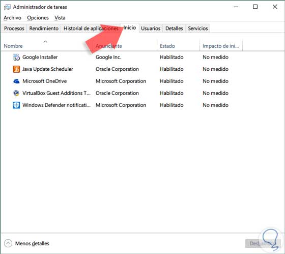 Una vez usemos cualquiera de esas opciones debemos ir a la pestaña Inicio para ver detalladamente que programas inician automáticamente.Para deshabilitarlo debemos seleccionarlo y pulsar el botón Deshabilitar ubicado en la parte inferior.