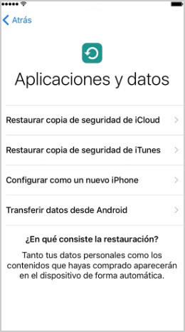 Para ello seleccionamos “Restaurar copia de seguridad de iCloud” o “Restaurar copia de seguridad de iTunes” según sean nuestras preferencias.
