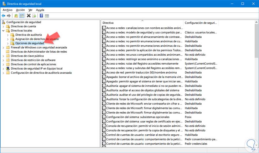 Se te abrirá la ventana de Directiva de seguridad local y allí debes ir a la siguiente ruta: "Directivas locales > Opciones de seguridad".