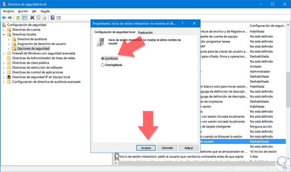 Haz doble clic sobre la opción ya mencionada y selecciona el apartado de "Habilitada". Después damos en Aceptar y cerramos la sesión normalmente desde el Menú de Inicio.