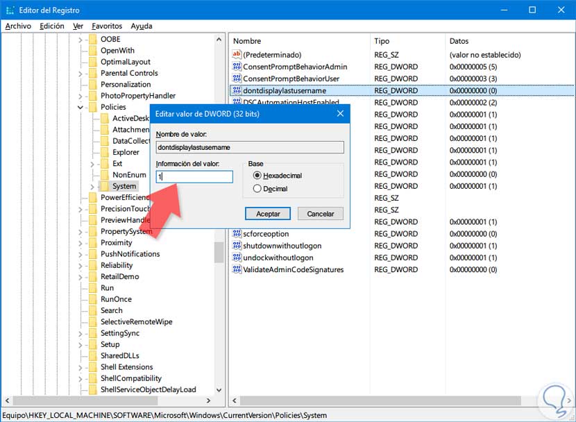 Busca la política que aparece bajo el nombre de "dontdisplaylastusername". Haz clic sobre ella y modifica el "REG D_WORD" cambiando el 0 por el 1.